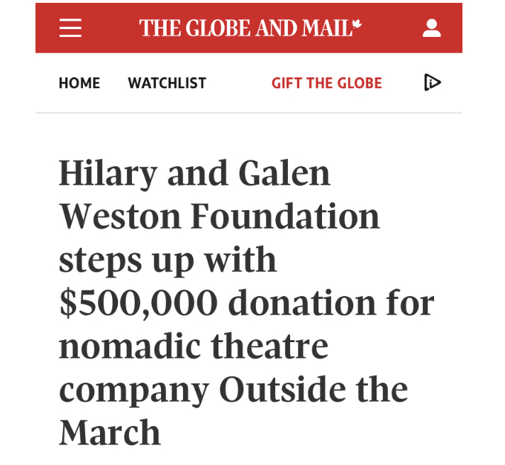 The project’s capital campaign has been launched by $500,000 from The Hilary and Galen Weston Foundation—the largest single gift in Outside the March’s history. The gift anchors $1.2 million raised to date of a $1.7 million first phase of fundraising and acquisitions. The project is already set to benefit our 2025 Season by providing the production equipment for two form-busting world premieres in surprising venues straddling either end of the city on Dundas West and Dundas East.