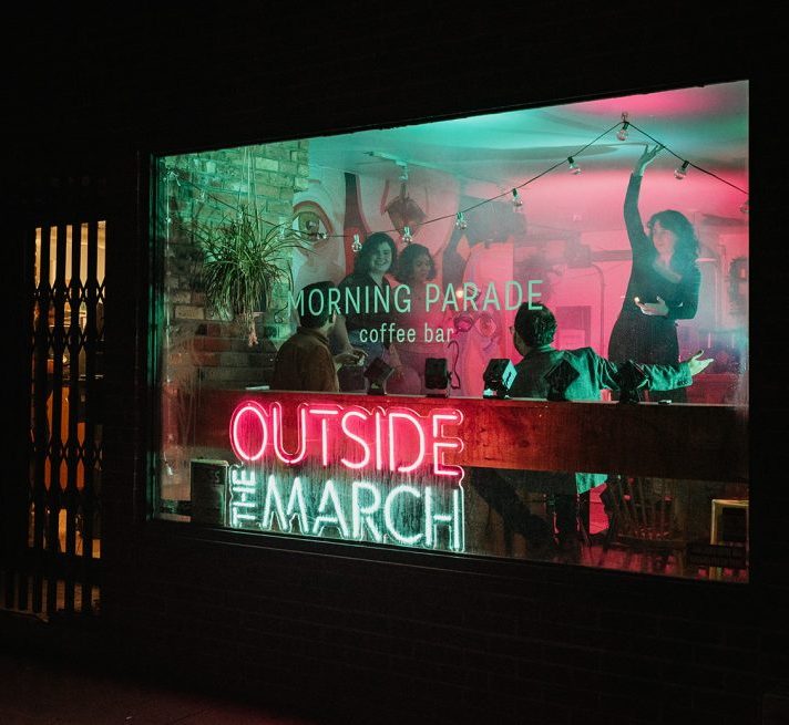 A bright neon Outside the March sign is light up just inside a storefront window, along with string lights. The cozy coffee shop inside is lit with specialized blue and pink stage lights. A man looks out from the window as a bundled up couple walks by, curious about what's happening inside.